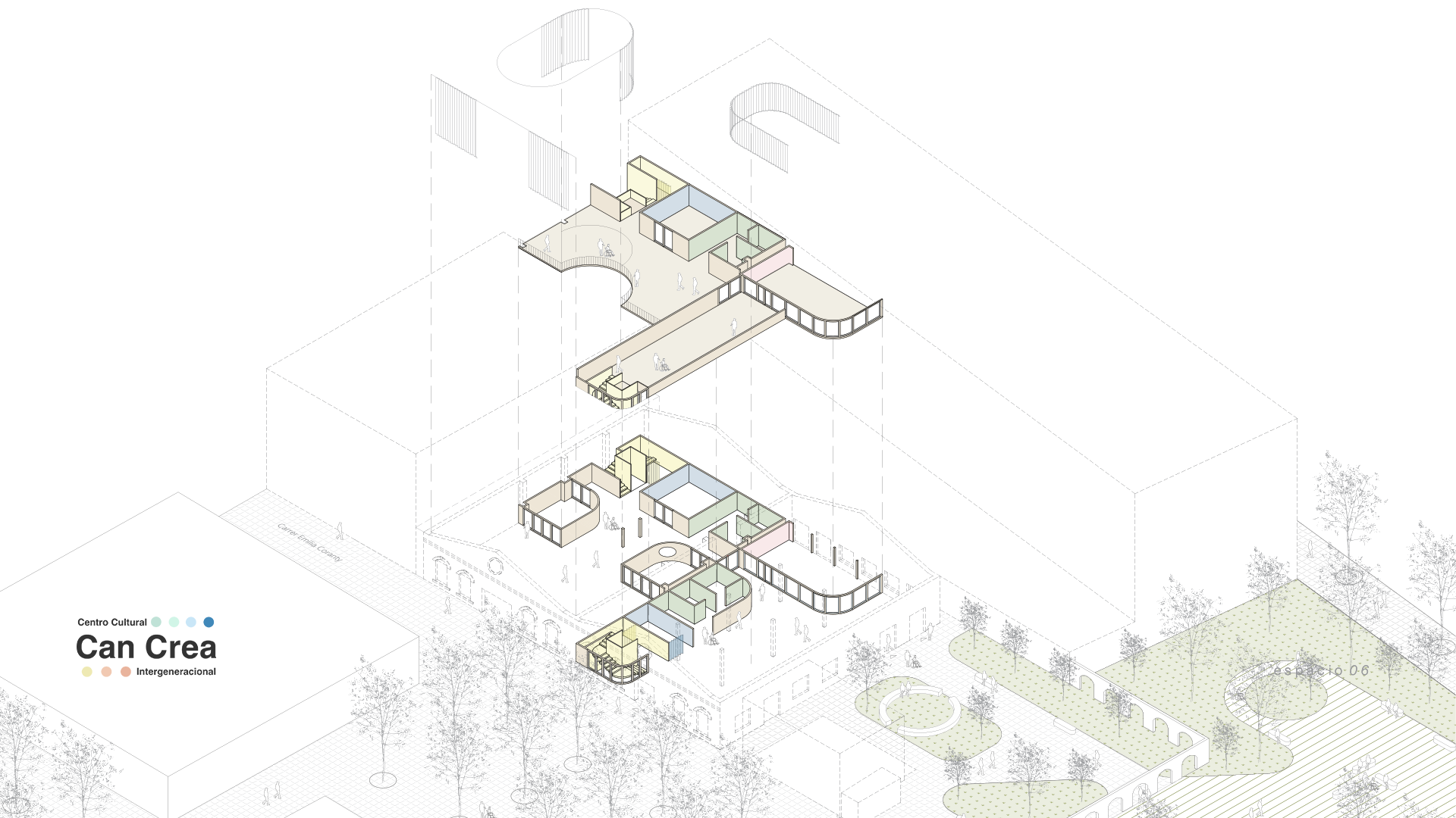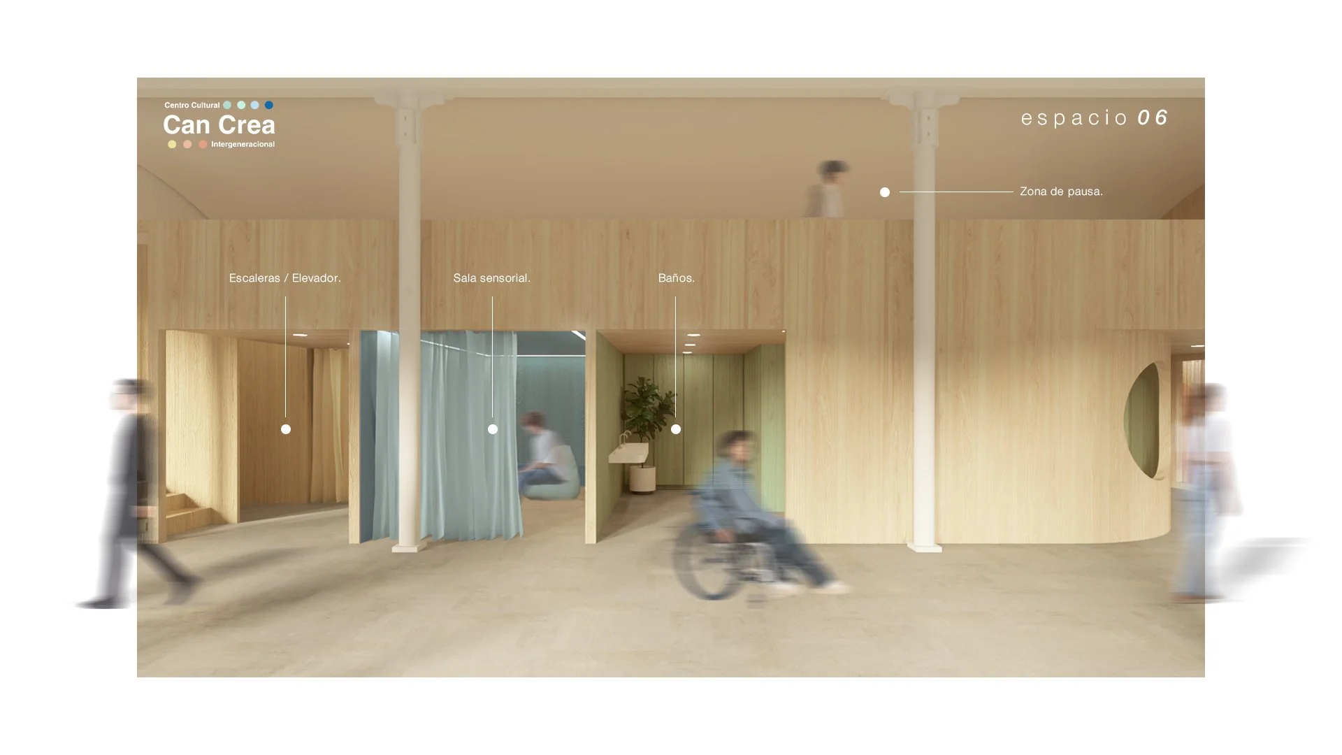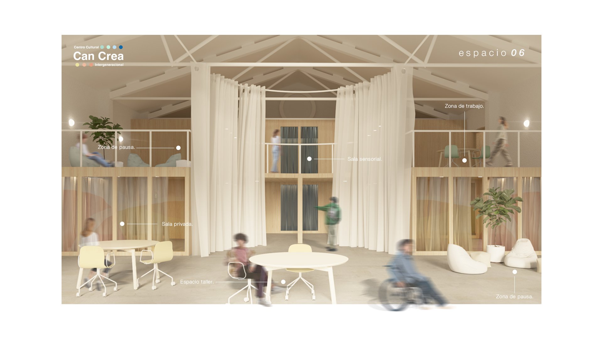 El proyecto busca ofrecer un centro cultural inclusivo y accesible para jóvenes con discapacidad intelectual mayores de 18 años, donde la participación, la creatividad y el aprendizaje se integran dentro de un entorno flexible y estimulante. Más que un espacio físico, Can Crea se concibe como una experiencia viva, diseñada para adaptarse a emociones y necesidades cambiantes.