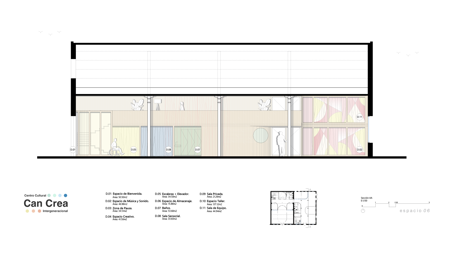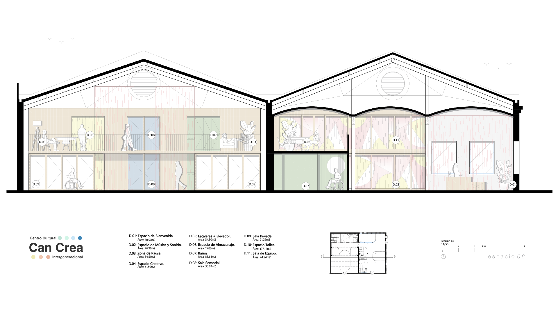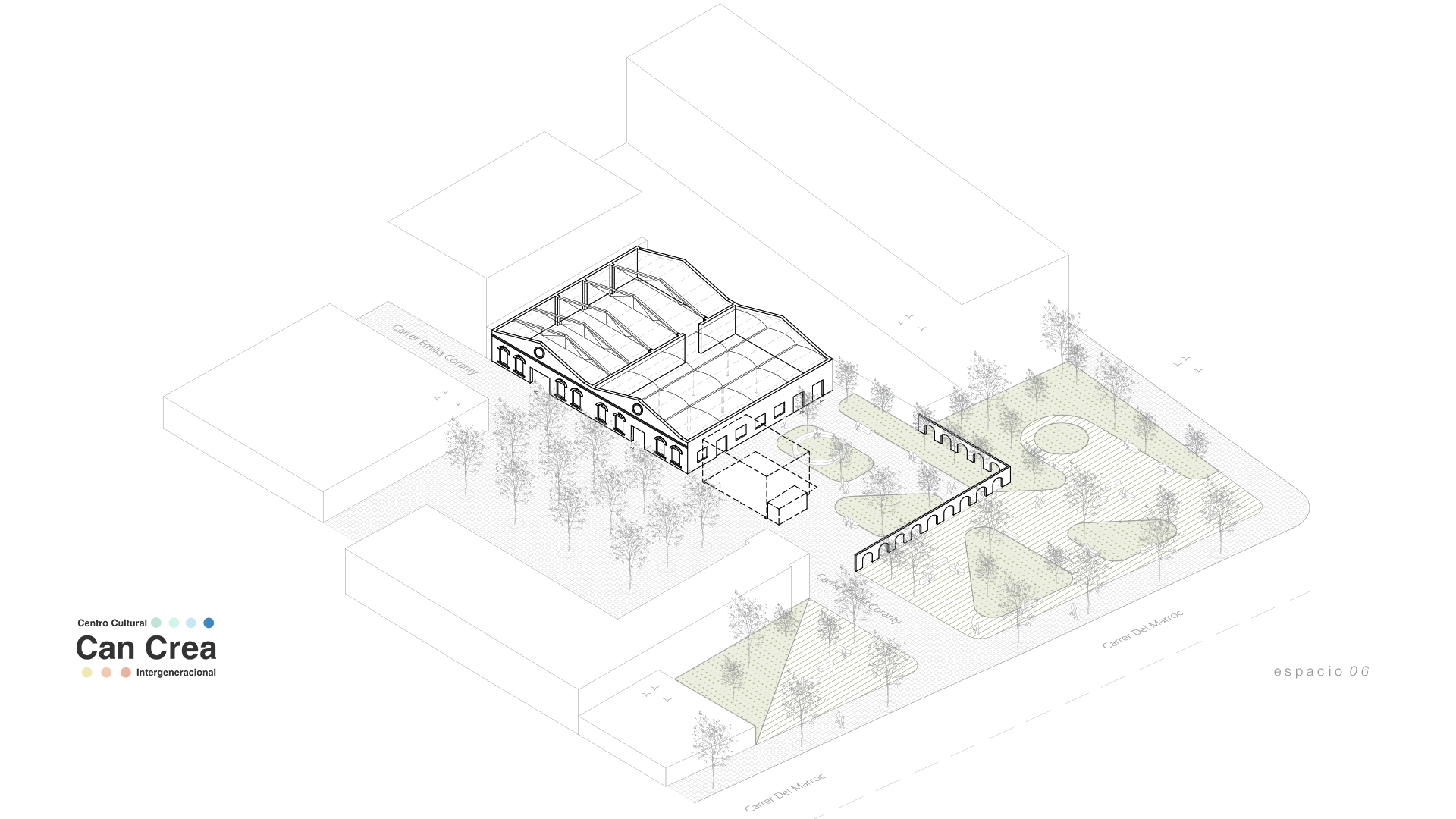 El proyecto busca ofrecer un centro cultural inclusivo y accesible para jóvenes con discapacidad intelectual mayores de 18 años, donde la participación, la creatividad y el aprendizaje se integran dentro de un entorno flexible y estimulante. Más que un espacio físico, Can Crea se concibe como una experiencia viva, diseñada para adaptarse a emociones y necesidades cambiantes.